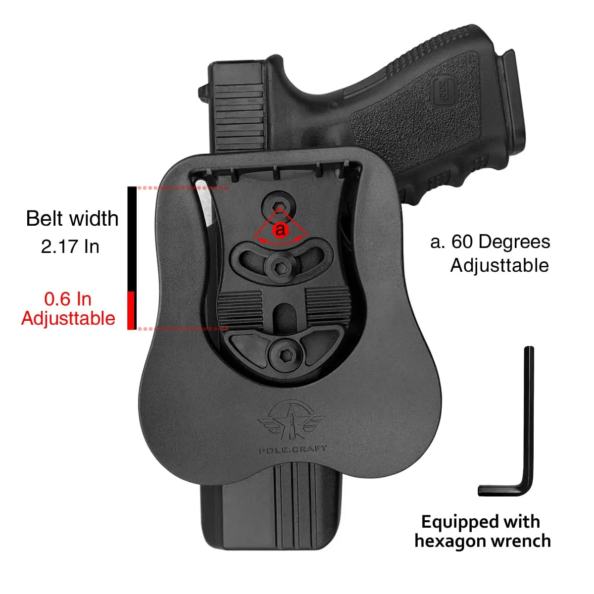 Adjustable Carrying Angle: This OWB Glock 23 holster is 60 degrees adjustable with the Allen Key (included). Simply rotating the paddle to get your desired carry angle.