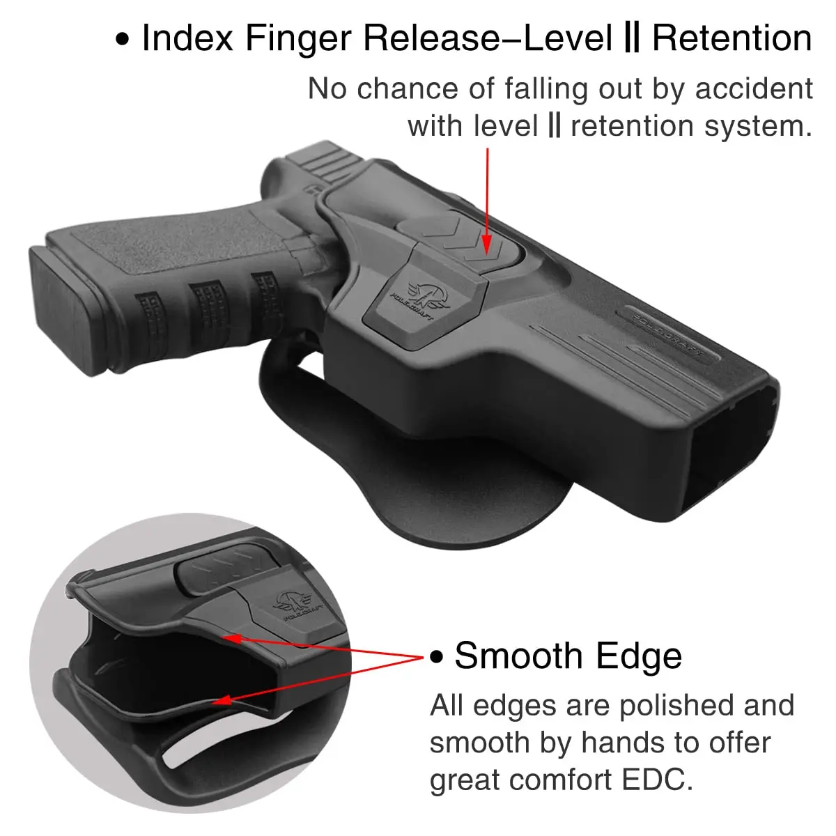 Quick-release Button: This Glock 19 Holster allows you to place your index (trigger) finger in the perfect position that enables a smooth, quick draw from this 60 degree adjustable holster.